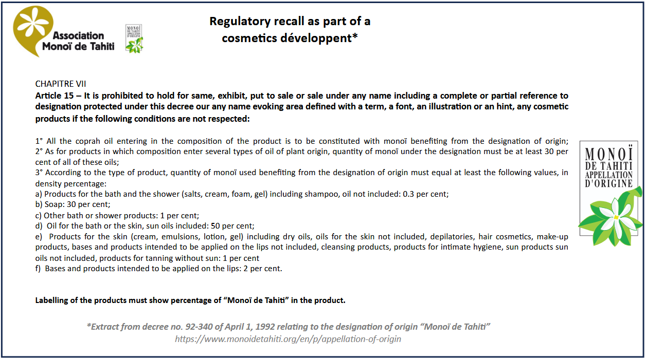 Desde abril de 1992, los ingredientes y el proceso de producción del Monoï de Tahití han sido estrictamente definidos por el decreto n. ° 92-340: